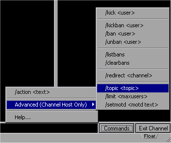 A ce stade, votre canal devrait être créé (NDT : ça peut prendre un peu de temps) avec vous à l'intérieur. Pour configurer les options du canal et voir les commandes accessibles à l'ôte du canal, cliquer sur le bouton "Commands" en bas à droite et sélectionnez "Advanced (channel Host only)", comme ci-dessous.