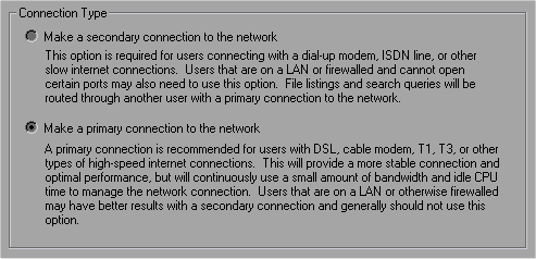 Afin d'établir une connexion Primaire vous aurez besoin d'une connexion Internet décente, soit câble, ADSL, T1 ou T3+. Les utilisateurs configurés en "Unknown, 14.4K, 28.8K, 33.6K, 56K, 64K ISDN et 128K ISDN" ne sont pas autorisé à établir une connexion primaire et donc ne peuvent pas créer de canal.