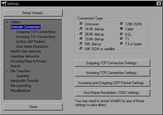 Si WinMX vous a demandé une config, lorsque vous avez cliqué sur "Make a primary connection to the network" vous devez donc le configurer (et éventuellement votre Firewall/Routeur) afin de pouvoir établir une connexion primaire. La première chose à faire est de cliquer "Settings" >Internet connection. Assurez vous que "Connexion Type" est coché soit en Cable, DSL, T1 ou T3+.