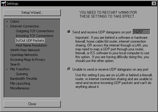 Maintenant procédez de même pour la configuration UDP en allant dans 'Settings > Internet Connection > In/Out UDP Packets'. Cochez 'Send and receive UDP datagrams on port...' et entrez un numéro de port comme ci-dessous (ici 16257)