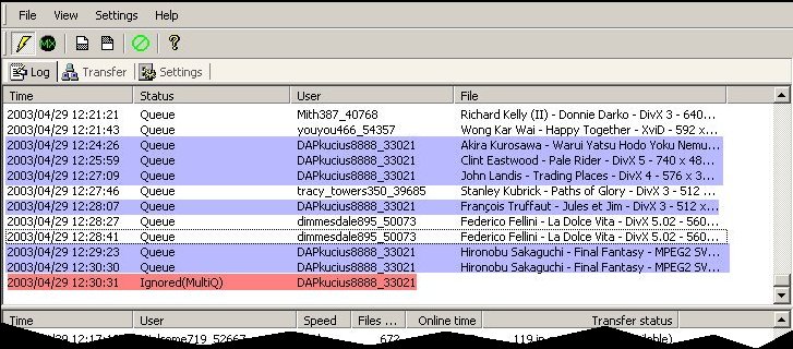 Ici, l'utilisateur DAPkucius s'est montré un peu trop gourmand en mettant en attente 6 fichiers. Ma limite maximum est de 5, il a donc été ignoré (Ignored(MultiQ))
