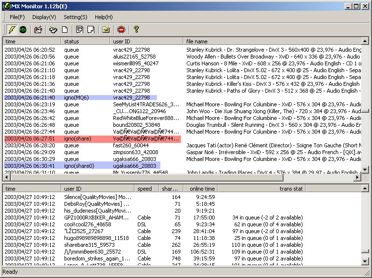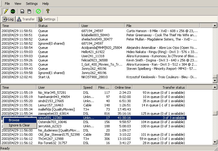 L'utilisateur Vince591 qui partage 17 fichiers est en ligne depuis plus de 41 heures et tous ses slots d'upload libres. Ça me parait suspect, je peux cliquer sur "browse" pour vérifier la liste de ses fichiers (qui sont peut être des fichiers vides, ou sans intérêt, partagés uniquement pour éviter que MXMoni ne l'gnore). MxMoni force alors winMX àouvrir un browse des fichiers de cet utilisateur, et, si mes soupçons sont confirmés, un autre clic droit me permettra de l'ignorer et de l'effacer de ma file d'attente (Ignore & Clear)