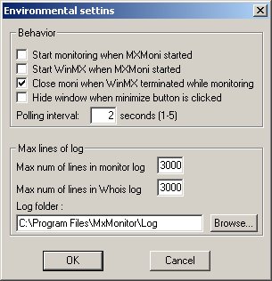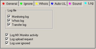 Start monitoring when MXMoni started : Lance le moniteur dès le démarrage de MxMoni Start WinMX When MxMonitor starts : Lance WinMx dès le démarrage de MXMoni Close Moni When Winmx Terminated. : MxMonitor quittera si vous Quittez winmx. Polling interval : intervalle de temps entre deux vérification des files d'attentes Max num of lines...: le nombre de ligne maximum dans le fichier journal (notez que les journaux repartent à zéro à chaque redémarage de MXMoni) Log Folder : emplacement où les fichiers journaux seront écrits (pas de fichier créés si ce paramètre n'est pas défini)
