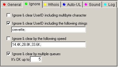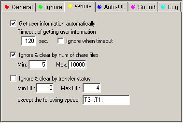 Ignore & Clear by numbers of share files : Tremblez sangsues (leeches), c'est le paramètre qui permet d'effacer et d'ignorer systématiquement les utilisateurs partageant moins de Min No of Sharing file (ici 5) et, accessoirement, plus de Max No of sharing file (ici 10000). Pour ma part je considère qu'un utilisateur doit au moins partager 5 fichiers et je laisse le maximum à 10000 fichiers partagés (je n'ai encore jamais rencontré personne partageant 10000 fichiers ;)).