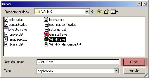 on clique sur Open et on recherche WinMX sur le disque dur :
