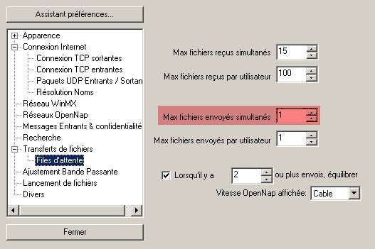 Limit the number of simultaneous UL : Ici le nombre maximum de fichiers envoyés simultanément. Il est important de noter que c'est le nombre de fichiers qui seront envoyés simultanément par WinMX ET par MxMoni. Pour que ce paramètre fonctionne correctement, il convient de régler le paramètre nombre de fichiers max envoyés dans WINMX à 1 (UN) :