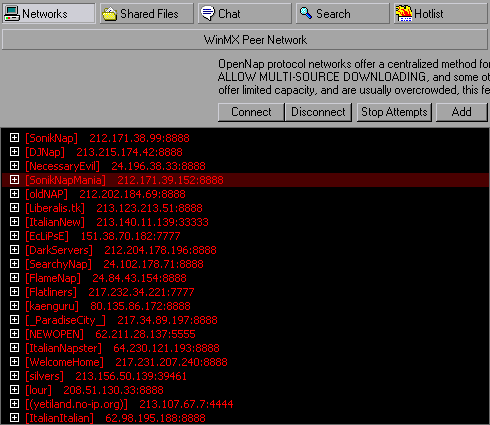 Egalement n'essayez pas de vous connecter à trop de ces réseaux OpenNap à la fois. Tentez vous limiter à 10 réseau OpenNap à la fois, dans la mesure où vous connecter à davantage dégrade l'état du réseau pour tout le monde (vous y compris)