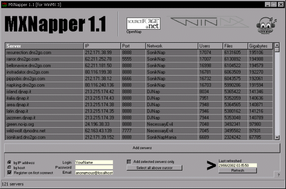 1... cliquez sur le bouton radion 'by host'. 2... Cochez la case 'Register on first connect'. 3... Entrez le nom d'utilisateur que vous voulez utiliser dans le champ 'Login'. 4... Entrez, si vous le désirez, un mot de passe, ou bien laissez vide, WinMX assignera alors un mot de passe aléatoire 5... Entrez *N'importe quoi* dans le champ 'Email' , Pour des raisons de confidentialité il est préférable de ne pas donner votre adresse email. 6... Cochez la case 'Add selected servers only' si vous voulez n'ajouter que les serveurs que vous sélectionnez. 7... Vous pouvez sélectionner un serveur et cliquer le bouton 'Select all above cursor' pour sélectionner tout depuis le début de la liste jusqu'au serveur sélectionné 8... Maintenant cliquer sur le bouton "Refresh" ce qui connectera MXnapper au site web Napigator où il prendra la liste la plus récente des serveurs OpenNap. Si vous avez un firewall, celui-ci peut vous avertir que MXNapper essaie de se connecter, assurez-vous de l'y autoriser. 9... Lorsque vous avez reçu la liste et que tout est rempli à votre goût, cliquez sur le bouton "Add Server" pendant que WinMX s'exécute, les serveurs OpenNap seront alors ajoutés automatiquement.