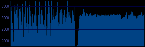 If you share a lot of files then you can often see a bad primary connection as soon as you start WinMX and the network connection goes green, if you flick over to the bandwidth graphs window at this point you can usually gauge whether the primary is good or not, you'll get used to seeing what good versus bad is after a while. The screenshots below show a good versus bad connection on my 56k modem connection when uploading a 2500 shared file list to the primary user, the 'BW Graph Rolling Average Duration' was set to 15 seconds for these shots.