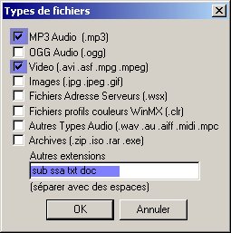 Pour commencer à partager, vous allez d'abord devoir définir les types de fichiers que vous voulez partager.Admettons que vous ayez déjà quelques vidéo et de la musique sur votre disque. Vous êtes aussi le docte auteur d'un traité sur la pêche à la truite dans les eaux du Mississipi dont les foules ébahies vont bientôt pouvoir se délecter au format word .doc et vous décidez de partager également cela. Cliquez sur le bouton "Type Partagés" et le dialogue suivant s'ouvre :