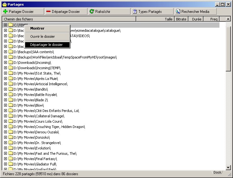 Dans la mesure où cette recherche est très exhaustive, il est probable que vous allez vouloir exclure de vos partages certains des fichiers qui ont été trouvés. Pour ce faire sélectionner la ligne en clic-droit dessus et "Départager le dossier' comme montré ci dessus.