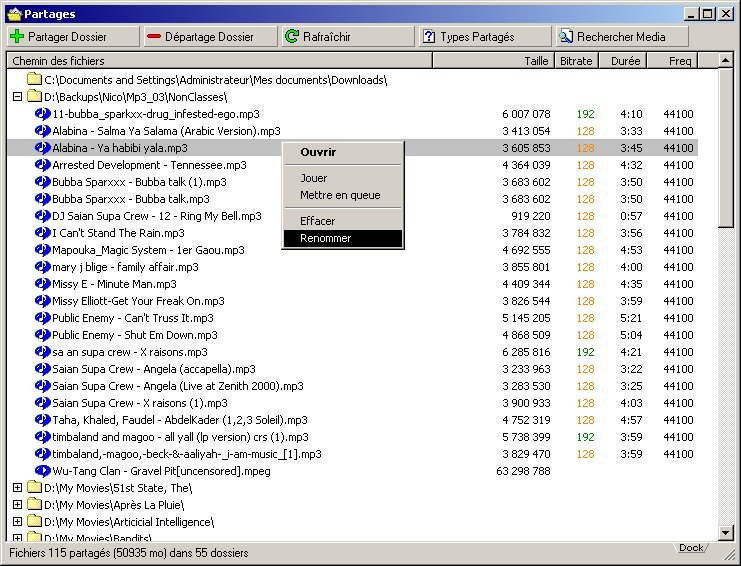 un fichier partagé un clic sur le vous affichera la liste des fichiers partagé dans ce dossier, un clic-droit sur le nom de fichier vous permettra alors de Renommer ce fichier